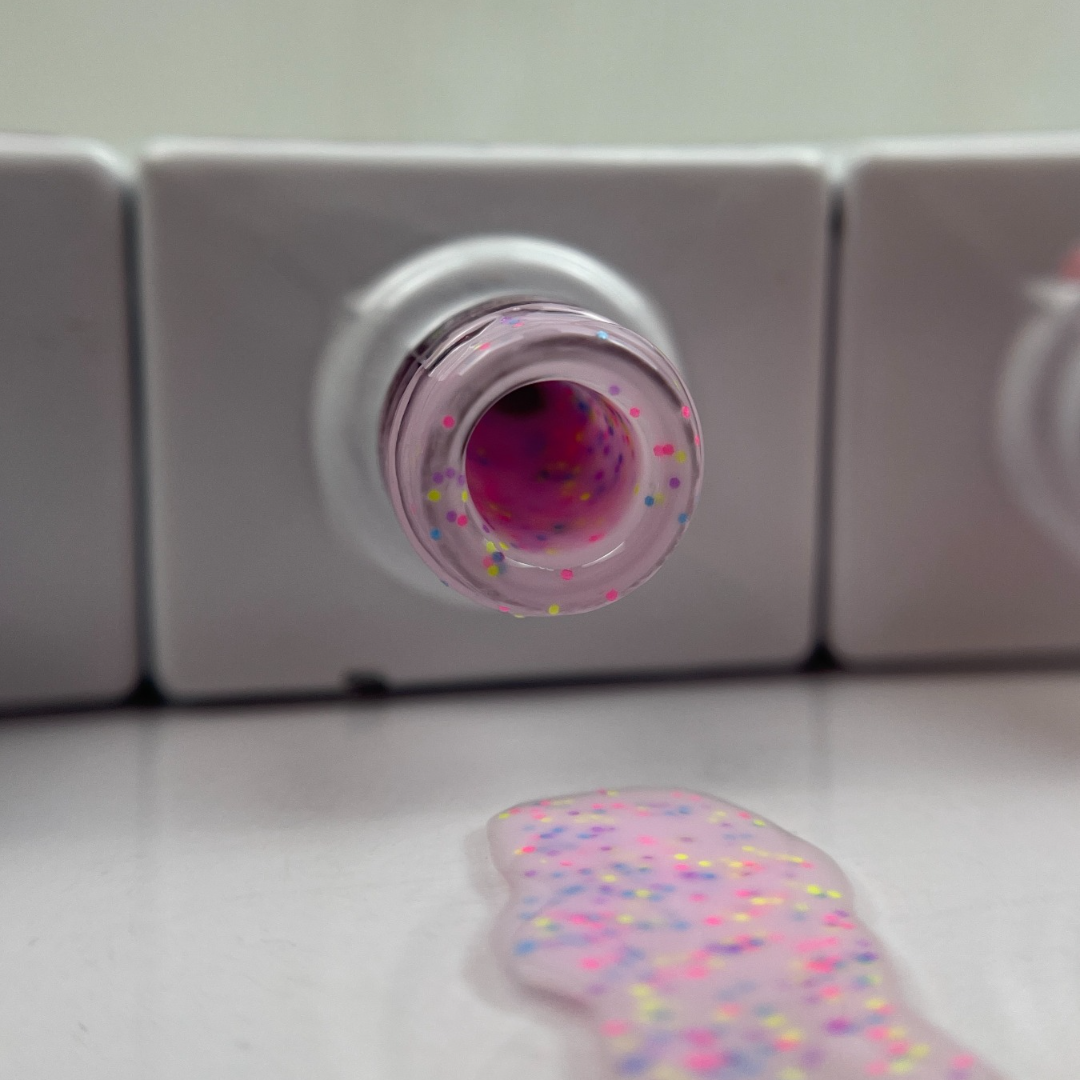 Nuestor LolliPop Gel 01 es un esmalte en gel semipermanente en tono Rosa mezclado con confeti.