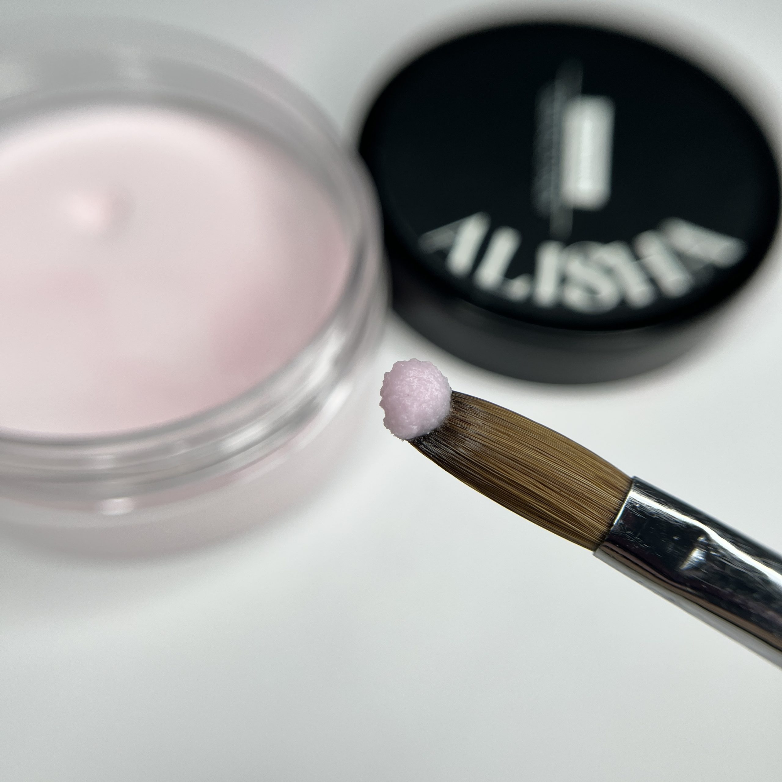 - Inserta la punta del pincel verticalmente en el polímero, durante 2-3 segundos, hasta que se forme la perla de acrílico. La perla no puede ser ni demasiado líquida ni demasiado seca.